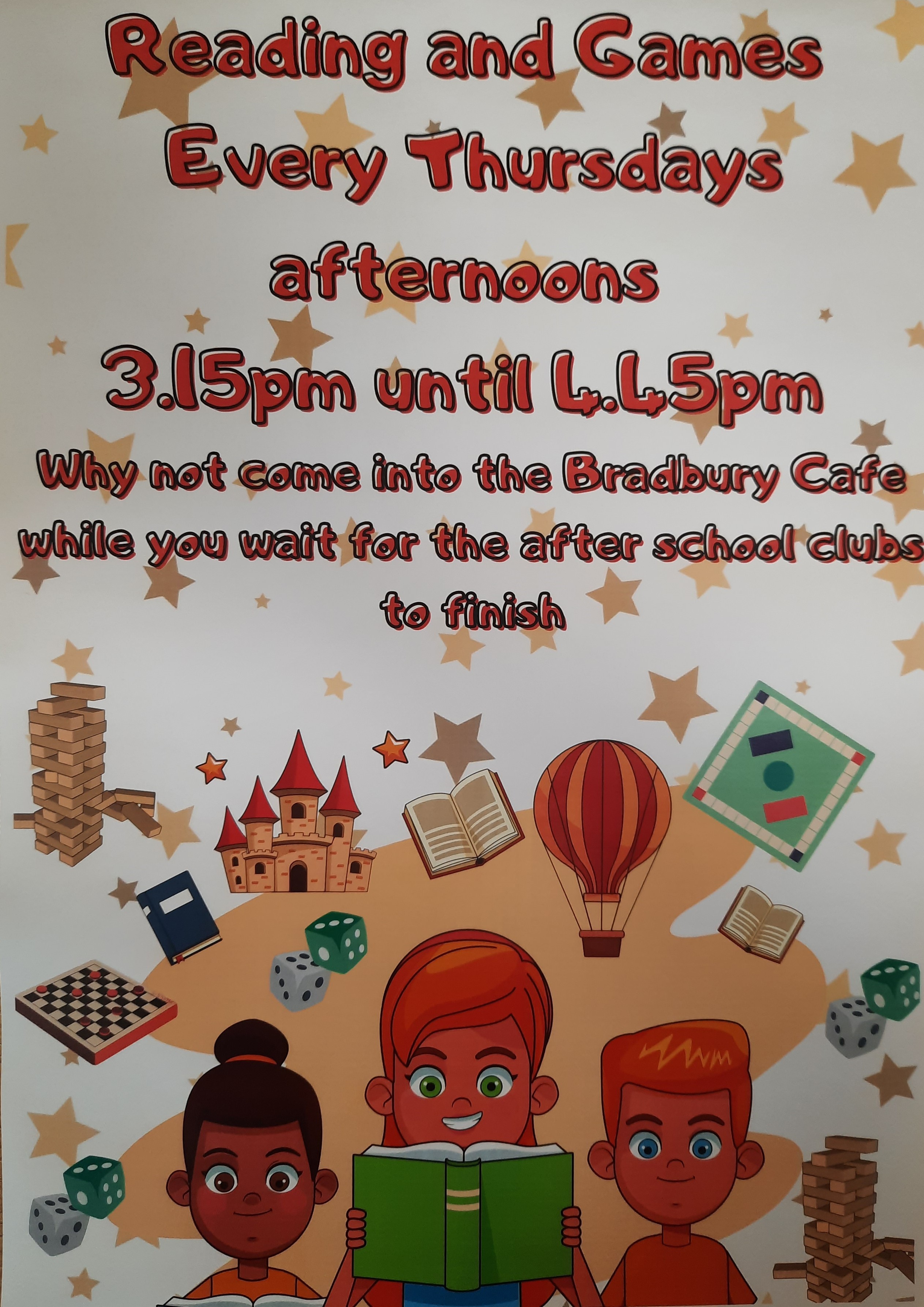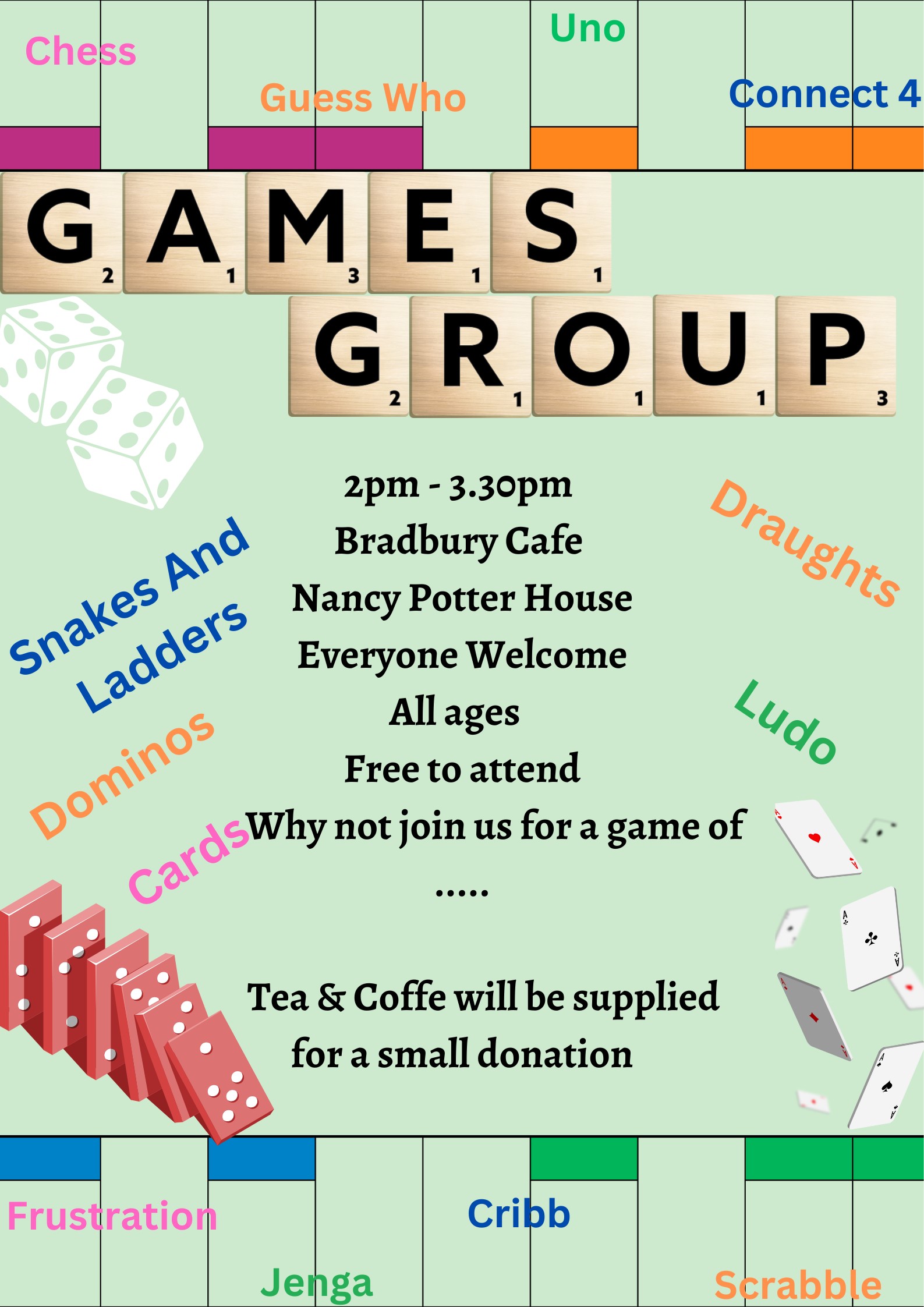 Come into Nancy Potter House and play some board games in the Bradbury Cafe Treat yourself to tea, coffee or some lunch at the same time Open to everyone no membership required All ages welcome