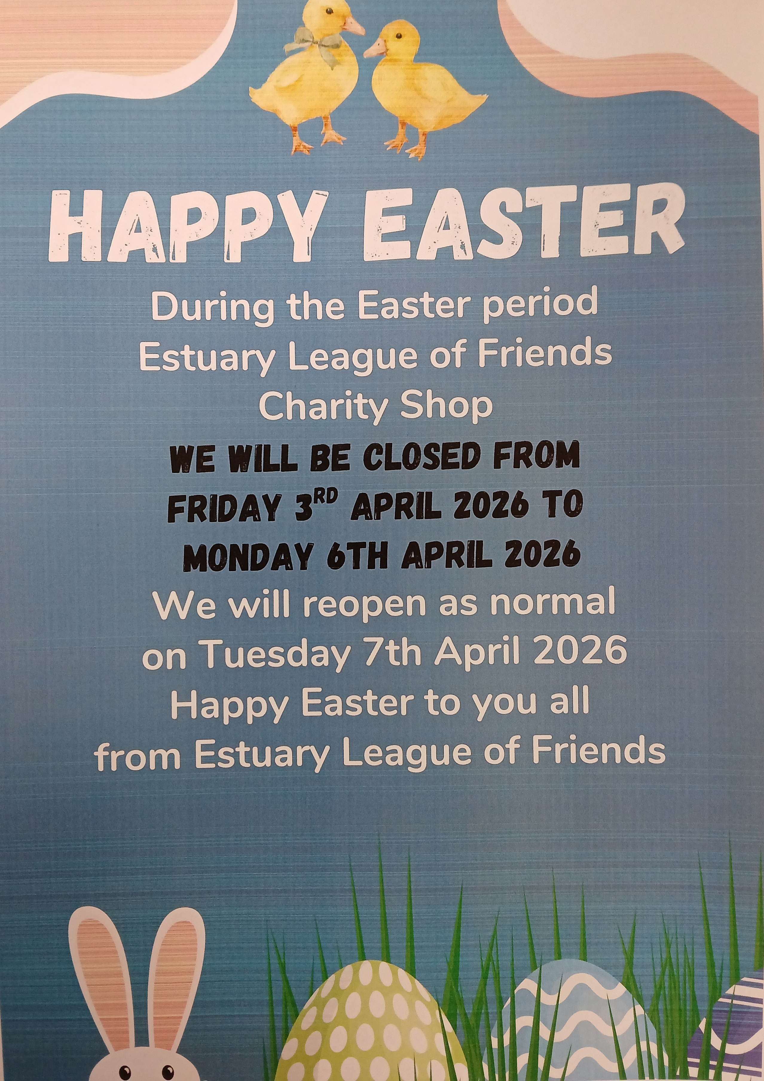 Please note that Estuary League of Friends Charity Shop will be closed Friday 3rd April (Good Friday) and Monday 6th April (Easter Monday) and we will reopen on Tuesday 7th April at 9.