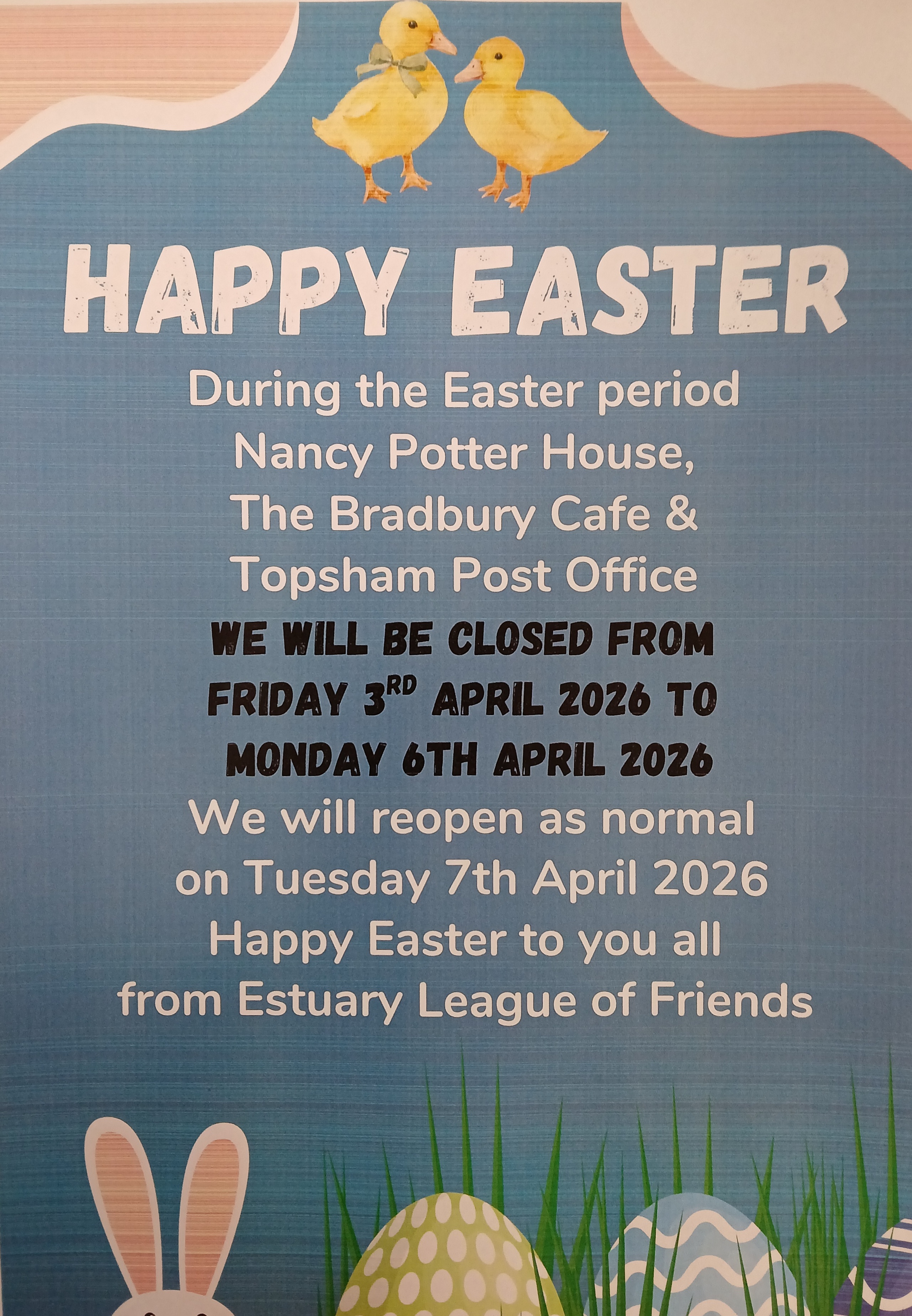 Please note that Nancy Potter House, Topsham Post Office and The Bradbury Cafe will be closed Friday 3rd April (Good Friday) and Monday 6th April (Easter Monday) and we will reopen as normal on Tuesda